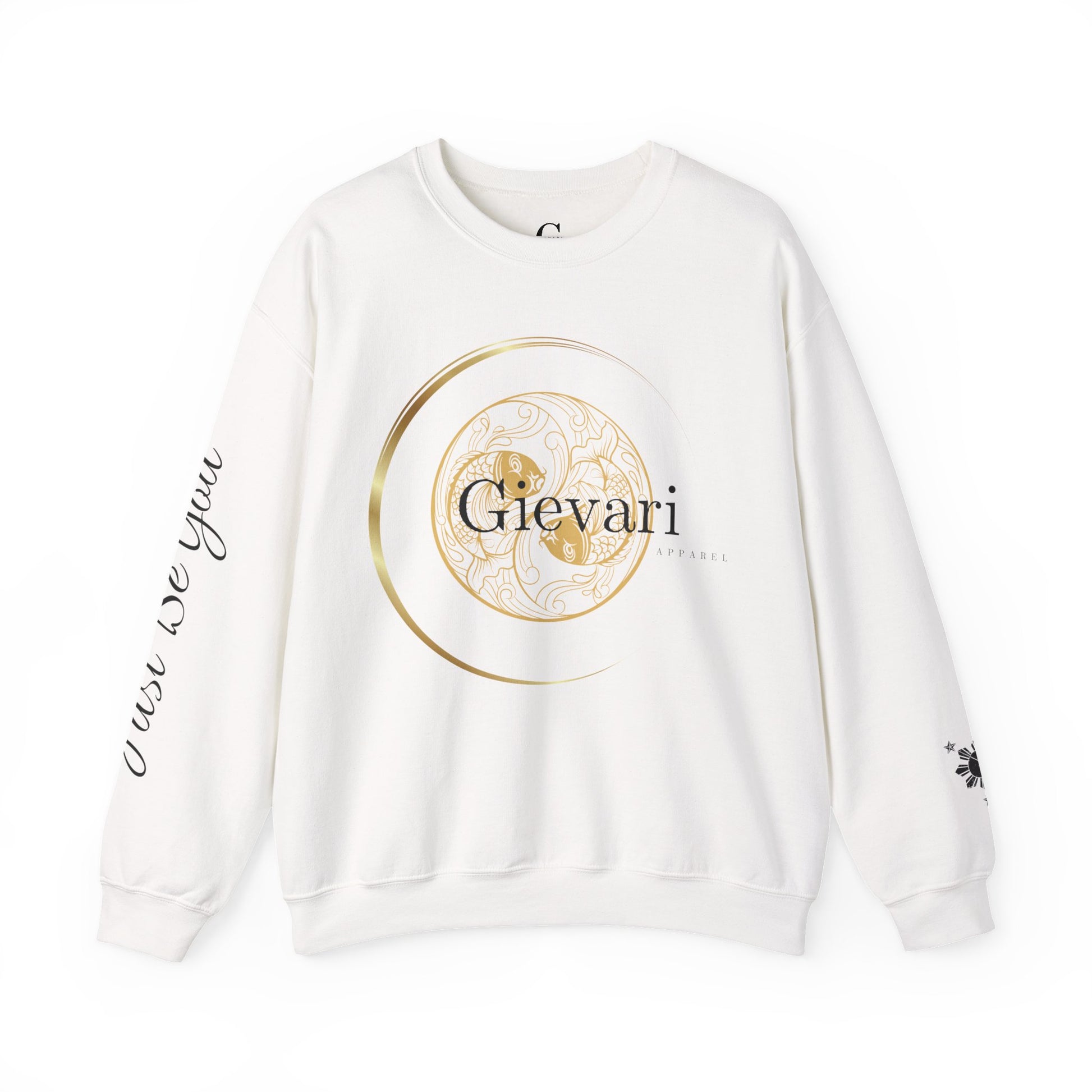 Elevate your wardrobe with the Gievari Crewneck, a statement piece that combines luxury fashion with a powerful message. Featuring the signature Gievari Gold/Black Design logo on the front and "Just Be You" Print on the right sleeve, this crewneck encourages you to live authentically and embrace your true self. The Filipino sun, proudly displayed on the sleeve, honors your heritage and the strength of your roots.